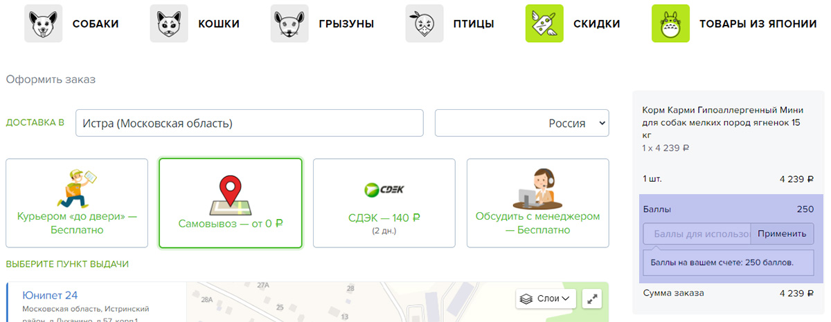 Завершая покупку, вам необходимо ввести имеющиеся у вас бонусные баллы в полe "Бонусные баллы", и стоимость вашей покупки будет автоматически пересчитана.